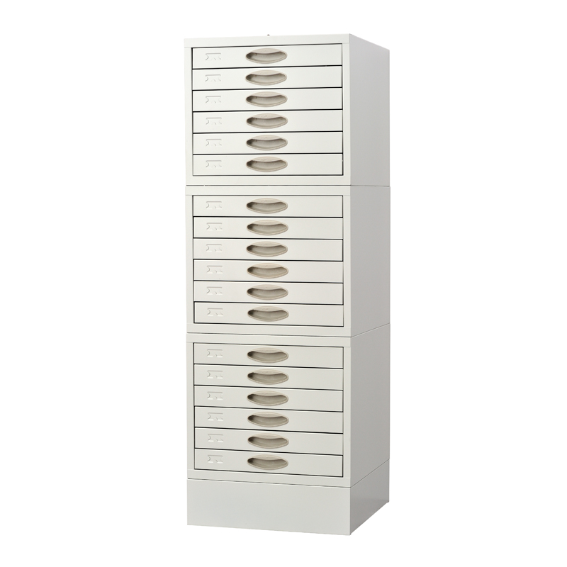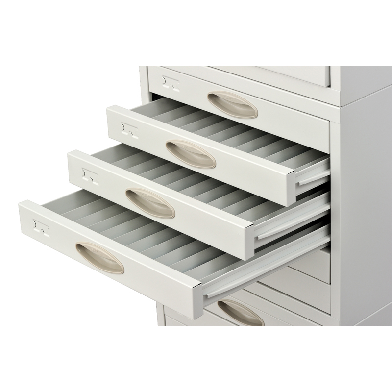 The base is made of SPCC1.2cold-roll steel sheets,the main body and drawers are made of SPCC 0.8 cold-roll steel sheets.This cabinet includes a base and three modules on the top that contain 18 drawers(6 drawers in each module)that accommodate up to 11,000 tissue blocks.Movable dividing boards inside the drawers make filing more flexible.